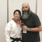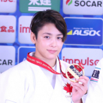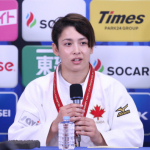 試合後の会見でキリッとした表情で記念撮影に応じる出口クリスタ