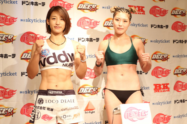 共に計量をクリアした杉山(左)を相手に「会場をひっくり返してやる」と激勝宣言