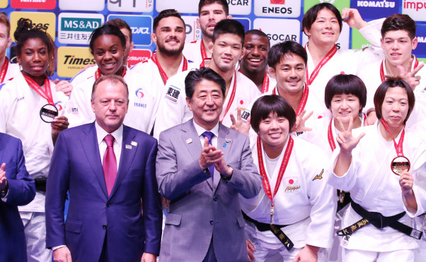 プレゼンターの安倍総理が優勝した日本選手団と写真に収まる