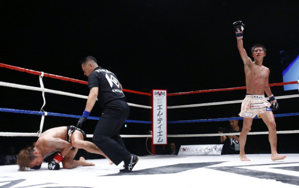 安本の怒涛のパンチ連打に駿太がダウン(19年8月)