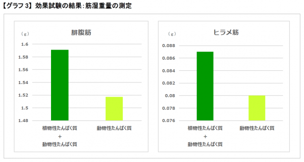 植物性たんぱく質と動物性たんぱく質を同時に摂取すると、筋肉の萎縮(やせること)を抑制する傾向が認められた。