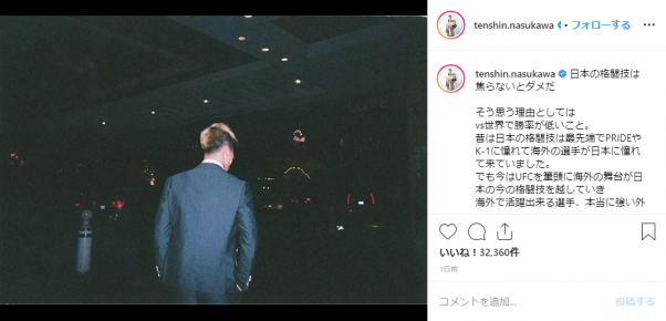 自身のSNSで語った"危機感"は大きな反響を呼んだ@tenshin.nasukawaより