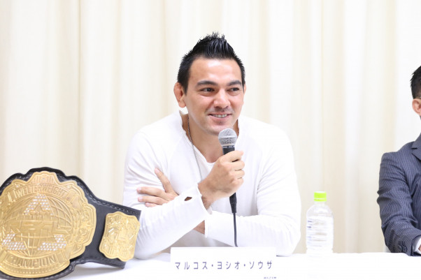 MMA団体「REAL FCのベルトをもって会見に臨んだソウザ「弟と同じようにびっくりさせたい」