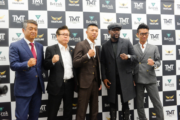 左から 大柴哲(TMTJAPAN代表取締役)、瀬端幸男(大貴ボクシングジム会長)、内山高志(元WBA世界スーパーフェザー級スーパー王者)、フロイド・メイウェザー・jr、徳弘浩平(TMTJAPAN CMO)