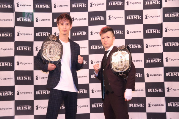 61kg級で優勝した同じジムの白鳥とベルトを持って2ショットに収まる那須川(左)