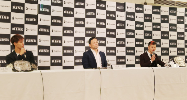白鳥(左)と那須川(右)は共に会見へ出席(中央はRISE伊藤代表)