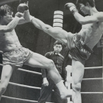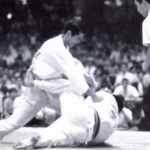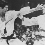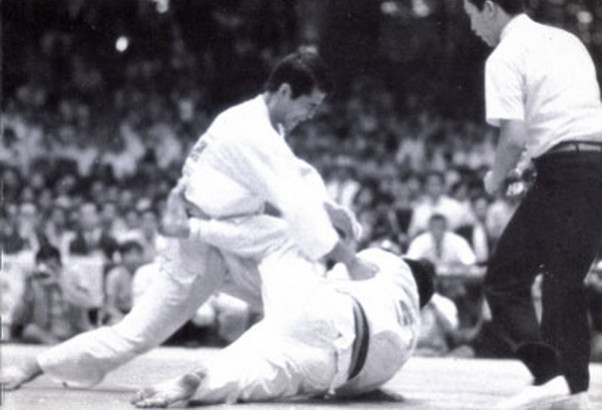 極真の第1回全日本で足払いから瞬間的に突きを決める山崎照朝氏(山崎氏提供)