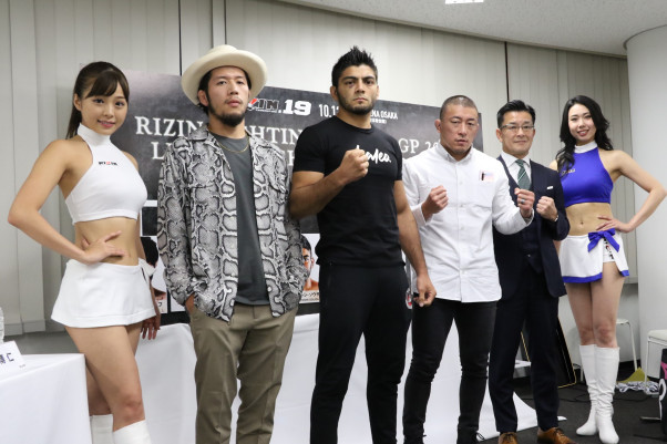 抽選会には上迫(左から2番目)、サトシ・ソウザ(中央左側)、川尻(中央右側)が出席、他選手は海外からインターネット電話で参加した