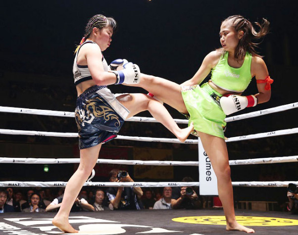 得意の蹴りを那須川梨々(左)に放つ佐藤