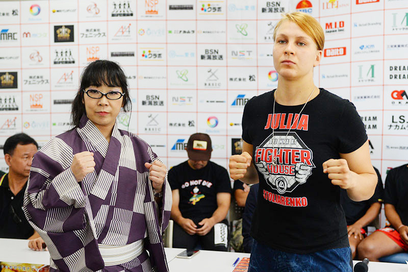 UFC帰りのラウェイ王者ユリア(右)と女子プロレスラー唯我がともに計量クリア