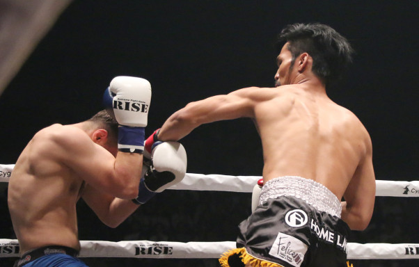9月のRISEで対戦相手をパンチで追いつめるスアキム