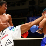 空手仕込みの鋭い前蹴りを突き刺す軍司