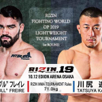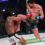 試合で飛び膝蹴りを放つフレイレ、KO勝利数はベラトールのレコードとなっている。