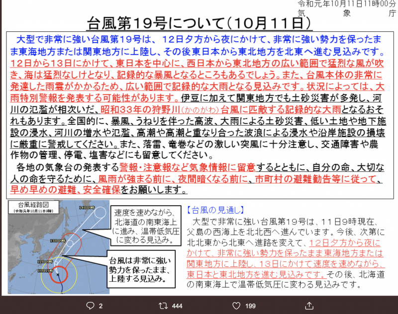 気象庁の11日11時の最新の台風情報の画像。12日夕方から非常に強い勢力を保ったまま東海、関東地方に直撃するという