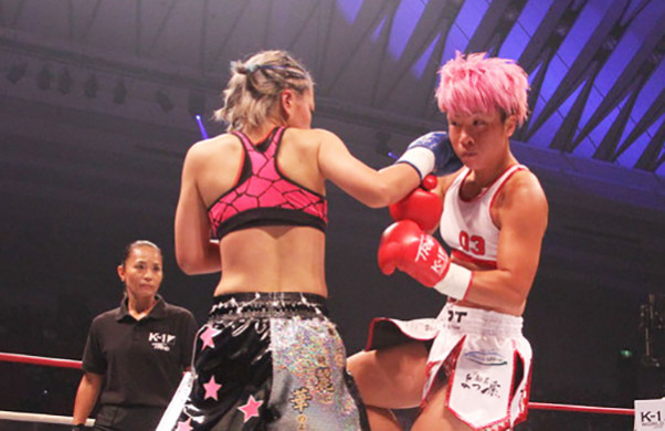 8月のK-1で真優はKANAと対戦、バックハンドブローを当てるなど健闘を見せた