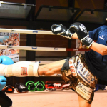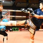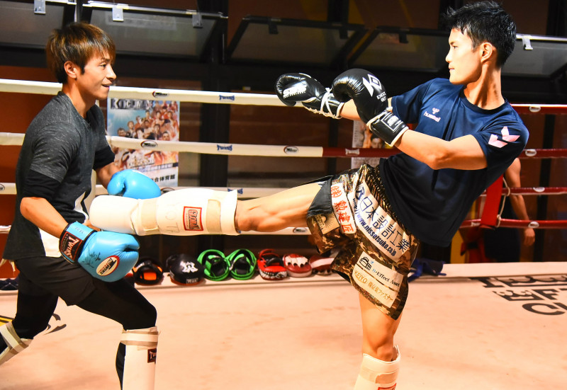 蹴り技を披露した重森(右)は日本ムエタイ界の大ベテラン相手にも「ヒジ・ヒザで勝負」と真っ向勝負の構え