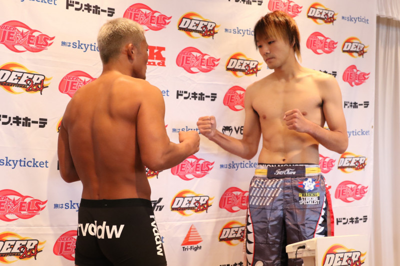 広い広背筋の武田(左)、大原は目を合わせないように目線を下に移している