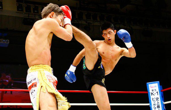 朝久空手をベースとする独特の間合いでKRUSHスーパーフェザー級トップ戦線に君臨する朝久(右)は2017年には大岩龍矢にも勝利