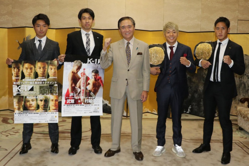 K-1ファイターが県知事を表敬訪問。左から西京春馬、中村拓己プロデューサー、黒岩祐治 神奈川県知事、武尊、林健太 (C)M-1 Sports Media