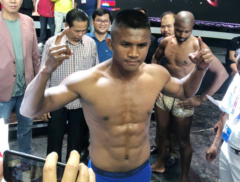前日計量で見事に割れた腹筋を披露するブアカーオ。全く問題なく71kgのリミットを下回った
