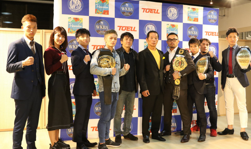 会見に臨んだ全選手と伊原信一新日本キックボクシング協会代表、山口元気REBELS代表
