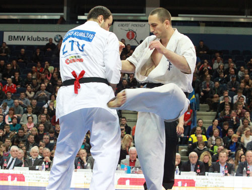 ヴァレリー・ディミトロフ(右)が得意のヴァレリーキック(踵でローを蹴る)を放つ