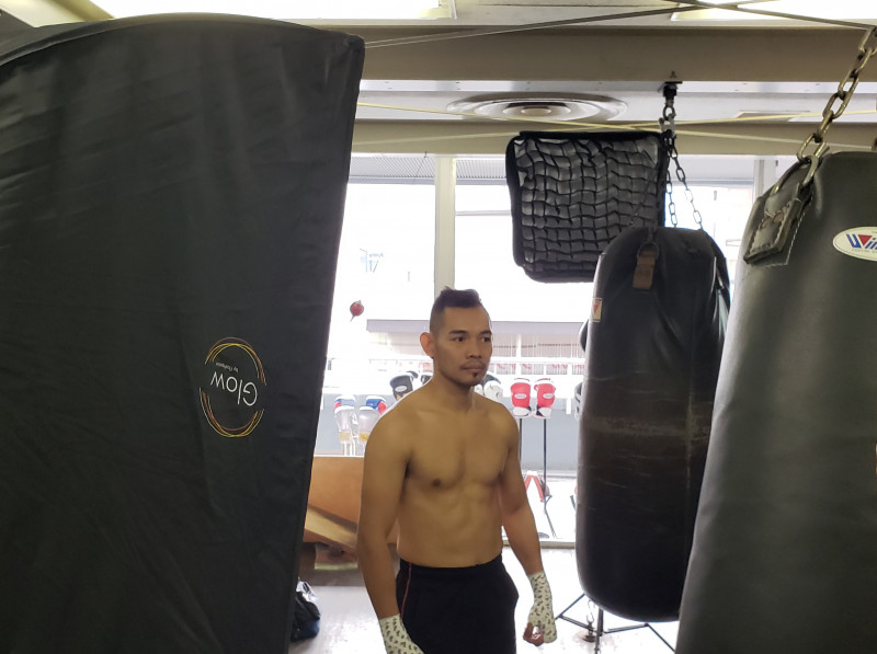 ドネアは撮影前に左右にあるカメラの照明機材の移動も手伝う気遣いぶりを見せた