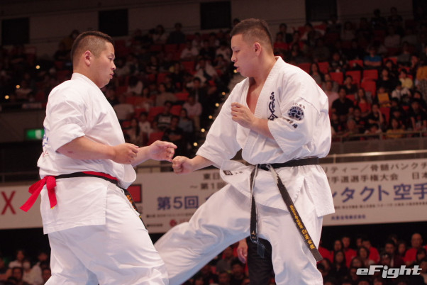 今年のJFKO全日本重量級で、今回の世界大会でも最重量(125kg)の落合光星(左)と戦う白蓮会館の山口翔大