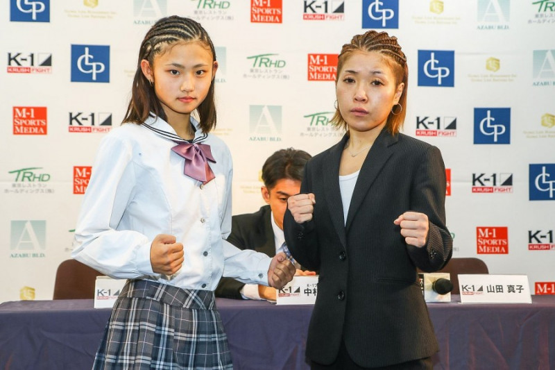 女子高生ファイターMOE (左)と元ボクシング王者・山田(右)が計量パス(C)M-1 Sports Media