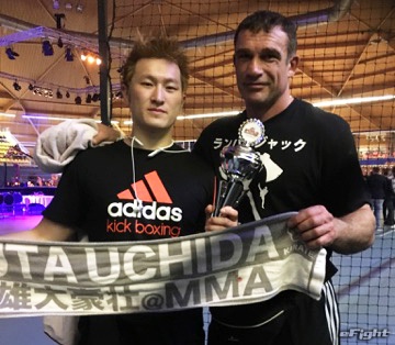 オランダでプロ初勝利した内田(左)をピーター・アーツも祝福(17年5月)