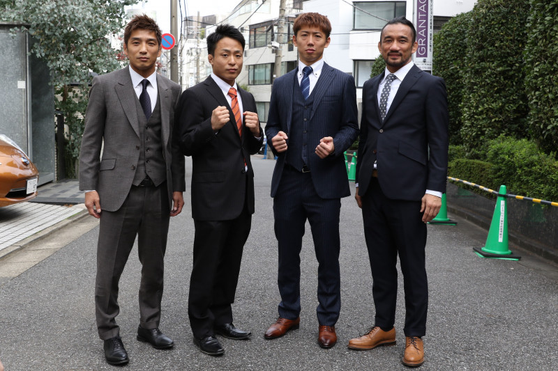 新体制第1回目の大会のカード発表。左から所英男、メイン出場の長野将大、セミ出場の萩原一貴、勝村周一朗プロデューサー