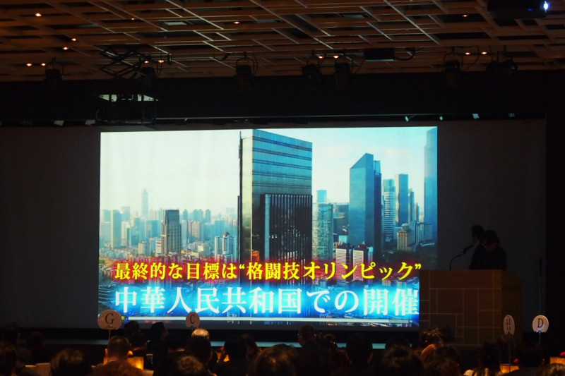 中国で格闘技オリンピック開催を目指すとスクリーンに大きく写し出される