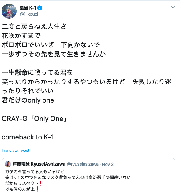 皇治は芦澤に「come back to K-1」とリプライ(@1_kouziより)