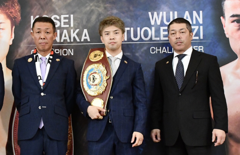 大みそかに田中恒成(中央)のV3をかけた防衛戦が決まった。左は畑中清詞会長、右は父である田中斉トレーナー