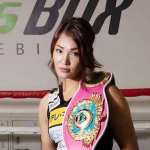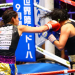 右ストレートを打ち込む吉田。ほぼフルマークの圧勝で世界王座を奪取した(19年6月)