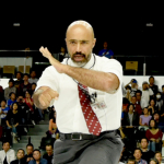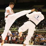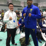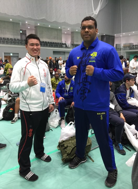 187cmの日本のエース上田幹雄(左)と並んでも210cm、140kgのナシメント(右)の大きさがわかる