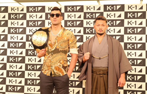 対戦発表の会見でタイトルマッチへ意気込む愛鷹(右)とカリミアン(左)
