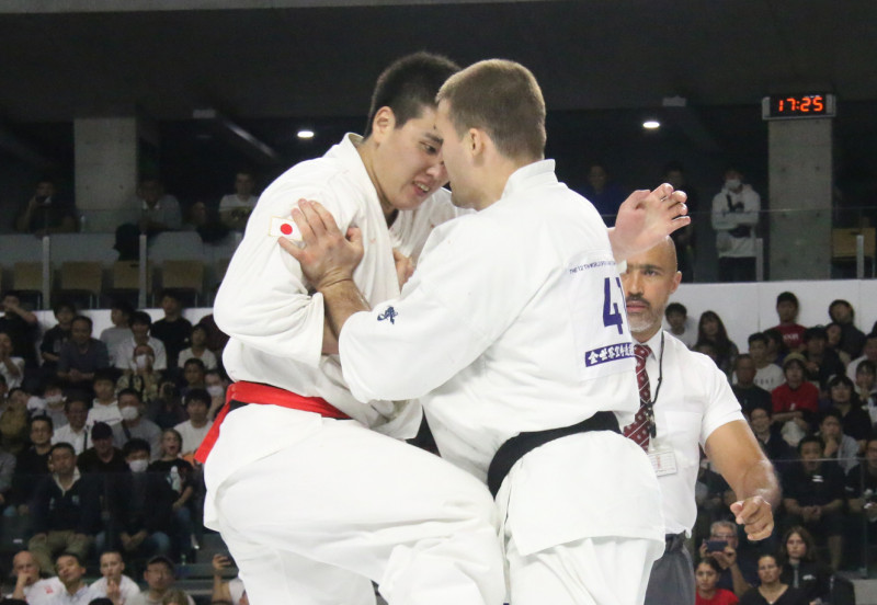 相手を掌底押しではね返そうとする選手(右)