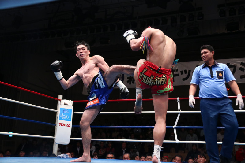 左ミドルをヒットさせる江幡睦(左)