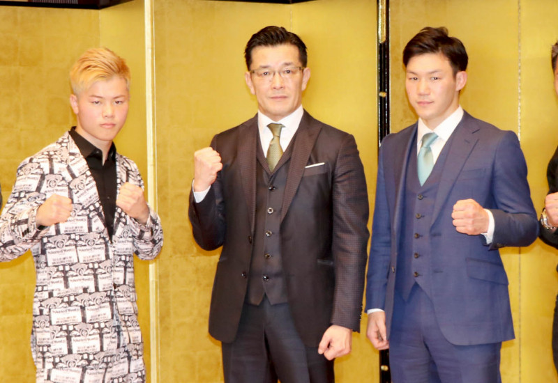 記者会見に出席した左から那須川天心、榊原CEO、江幡塁