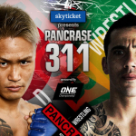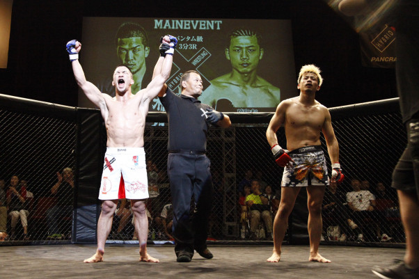 7月のメインで勝利し両手を上げ雄叫びをあげるお祭り男・三村