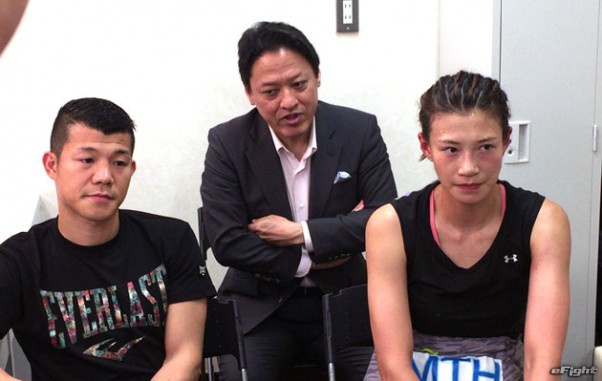 左から亀田興毅、金平会長、高野人母美=17年5月撮影