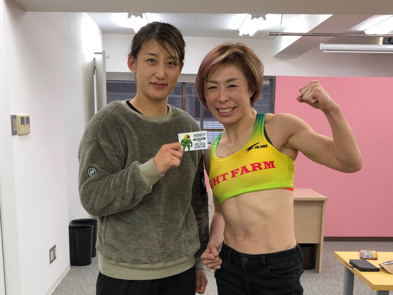 付き添いの杉山しずかと。杉山が持っているのは今回のために作成したプロモーションカード