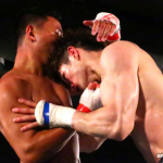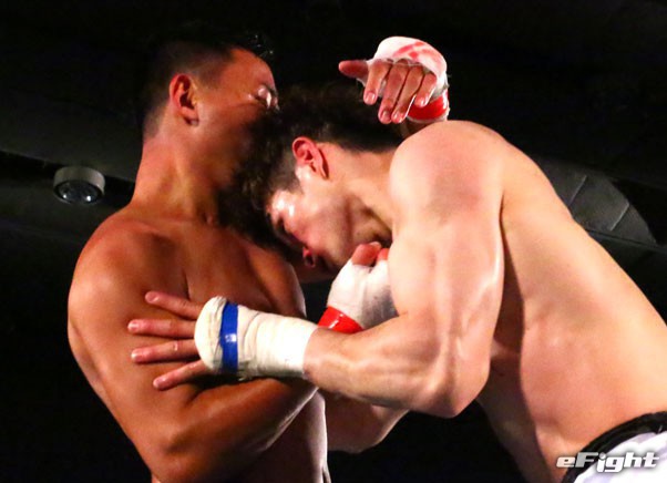 ラウェイならではの頭突き攻撃を見せる金子