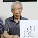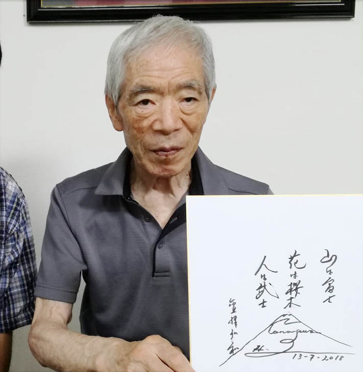 昨年7月、87歳の金澤氏。新空手道で最後のインタビュー時に「山は富士、花は桜木、人は武士」と色紙にサインを入れた