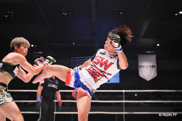 ムエタイ仕込みの強烈な蹴りを放つアム(右)=浜崎と今年の8月に対戦した