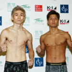 レオナ(左)と山本(右)が共にリミットの60kgで計量クリア(C)M-1 Sports Media