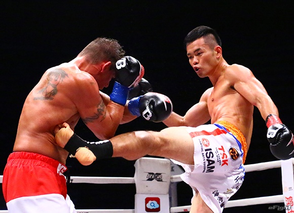 得意の三日月蹴りを食い込ませる日菜太