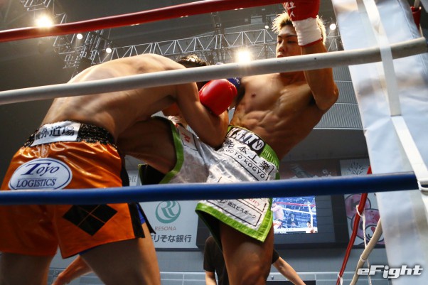 強烈なヒザを食い込ませダウンを奪う海斗