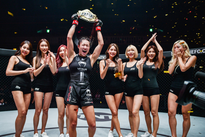 両国大会でアンジェラ・リーが勝利、7人のラウンドガールたちと歓喜